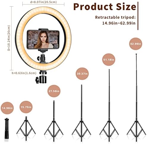 【Package Included】The product package includes a 10” ring light, a extended tall tripod stand, a hot shoe mount, a metal ball mount, a phone clip.