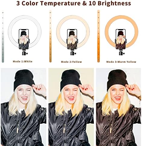 【Adjustable Brightness】3 colors lighting mode: white, warm yellow, and warm white. Each lighting mode has 10 level brightness, it can meet your different needs. This ring light includes 120 bulbs, more than other 8” and 9” ring light even some 12″ 14″ ring light.